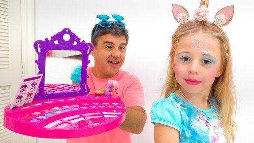Настя учится пользоваться детской косметикой