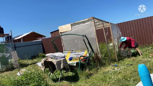 Разобрала старые постройки из стрейч пленки и делаю навес над качелями своими руками