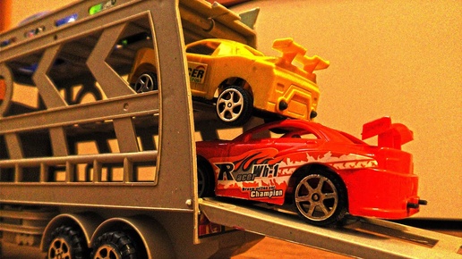 Plastic Car Toys Changing Location Then Taken Away by Transportation Vehicles