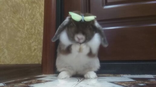 Кролик умывается с бабочкой на голове