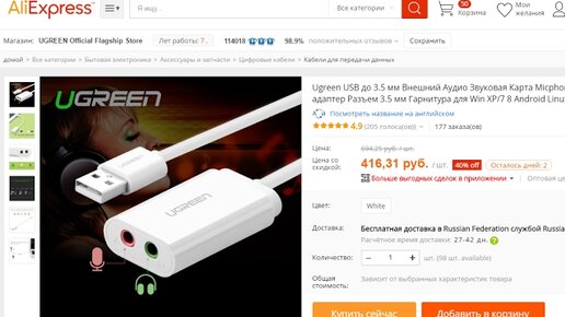 Внешняя USB аудио звуковая карта Ugreen с алиэкспресс 3.5 для компьютера или ноутбука