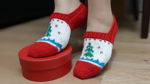 Новогодние тапочки следочки с Елочкой. Вяжем подарок к Новому Году своими руками