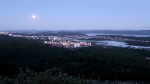 Лунная ночь и ранний расcвет над Миасской долиной. Гора Лысая, Миасс, Машгородок.