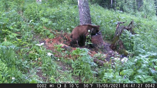 Медведь на приваде, пытается сломать железную бочку