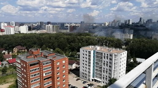 Город Пермь. Горит в логу улиц Овчинникова-Левченко. Вид с крыши дома.