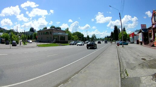 Туристическая прогулка по центру незнакомого большого поселения. Видны здания магазинов и "Сбербанка".