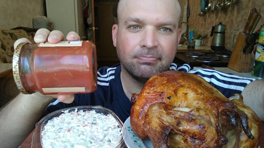 Кушаю курицу гриль и салат Оливье.