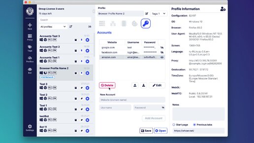 Демонстрация работы менеджера Аккаунтов - Undetectable браузер