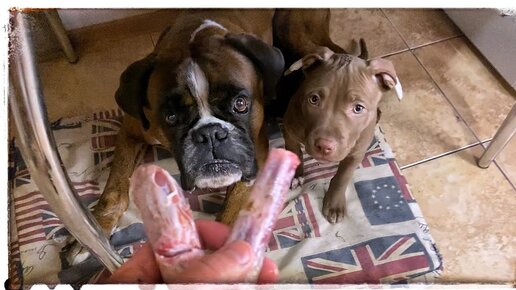 Подвязал ушки щенку питбуля . Собаки лакомятся говяжьими хвостами