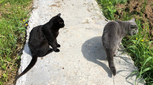 Наши котики (взрослый Тёма и мелкий Черныш) на утренней загородной прогулке.