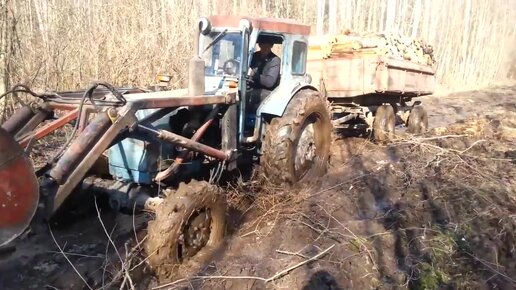 Трактор Т-40 тянет прицеп по грязи