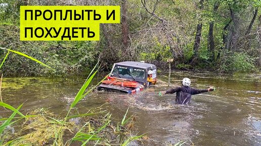 Штурман бежит с лебедкой и худеет, а JEEP WRANGLER плывет через озеро.