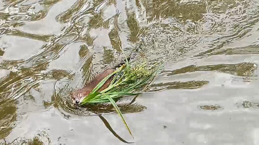 Ондатра плывет с веткой камыша в зубах, несет в домик. То ли строит что-то, то ли на еду...