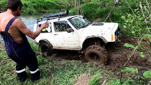 Jeep Cherokee закопался "по самые уши" благо когда есть лебедка.