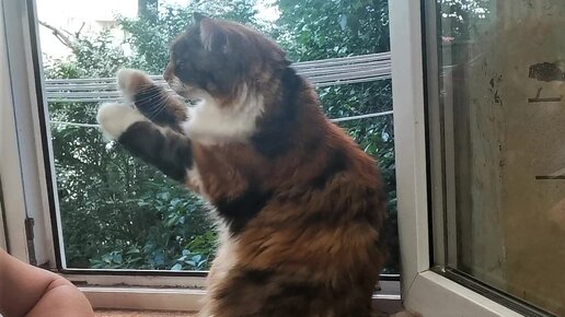 Маруська встает на задние лапки и просит кушать, при этом мяукает и машет передними лапками