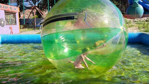 Дочка катается по воде в огромном шаре