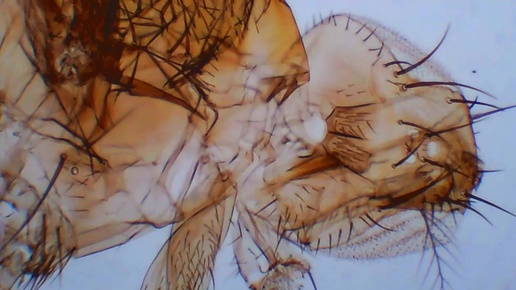 Мушка дрозофила под микроскопом.