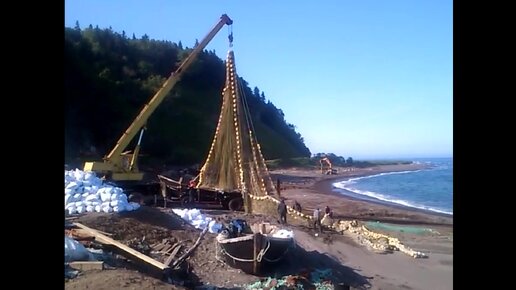 Как укладывают огромную рыболовную сеть в лодку, на Сахалине.