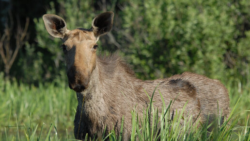 Встреча с лесной красавицей. Лосиха кормится болотными травами в прибрежной зоне