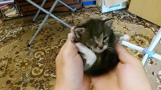 Маленький брошенный больной котёнок начинает выздоравливать