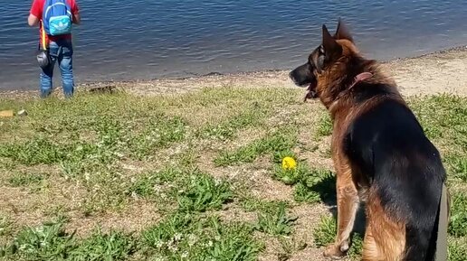 Овчарка хочет побежать к детям и принять участие. Очень интересная движуха.