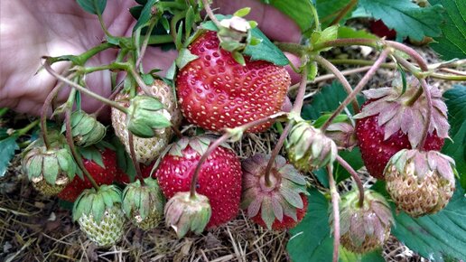 Клубника спеет. Показываю урожай с грядки первого года и выбираю правильные кусты