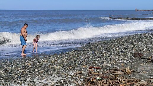 Такой вот отдых на пляже в Адлере: море волнуется, песок чёрный, на берегу ветки, купаться запрещено