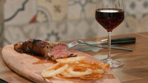 Стейк с луковыми кольцами в кляре
