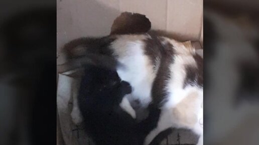 Маленький котёнок грызёт свою маму за хвост, он ещё не знает что будет дальше