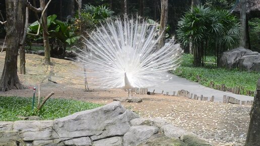 Белый и цветной павлины расправляют хвосты, красуясь перед павой