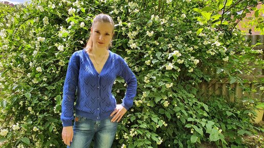 Ажурный кардиган с V-образным вырезом. Вязание спицами.
