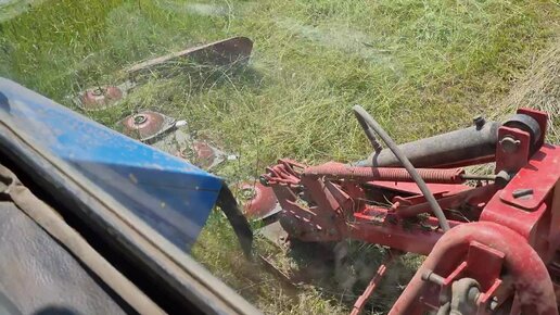 Трактор косит траву на скорости 15 км/ч - вид из кабины