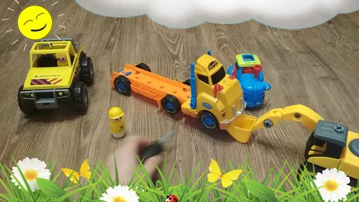 Синий Трактор Гоша помогает Грузовичку Леве, у которого отвалилось колесо. Игруныч Непоседа