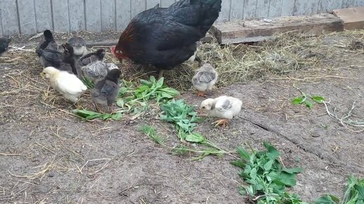Выпустила маленьких цыплят с мамочкой погулять. Двухмесячные цыплята уже подросли и почти опёрились