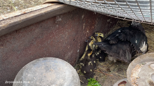 Первая утка этим летом выпарила утят. Петух мешает снимать утят, кидается драться