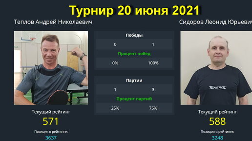 Встреча за 3 место Сидоров Л.(588)-Теплов А.(570) 20.06.2021 турнир по настольному теннису