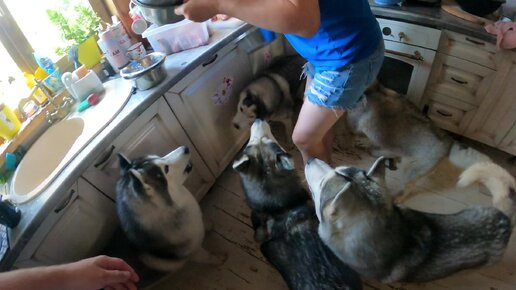 Жара, жарой, а обед по расписанию, даже летний зной +36 не может заставить хаски отказаться от еды.