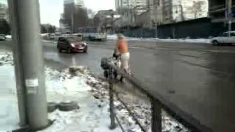 Сумашедший бомжеватый дедок посреди дороги с тачкой