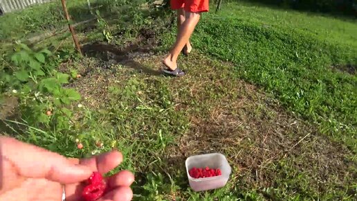 Поспела малина, подвязываем грецкий орех. Огурцы и кабачки растут.