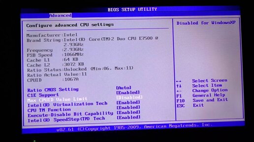 B.I.O.S. Раздел Advanced. Обзор пункта CPU Configuration.