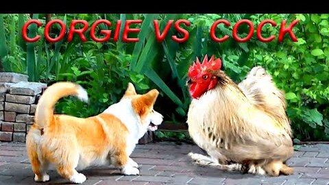 Битва КОРГИ и ПЕТУХА. Смешные щенки корги и петух Вася.