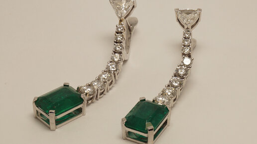 Шикарные подвесные серьги с Замбийскими изумрудами и бриллиантами в золоте 750 пробы.