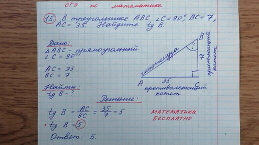 В треугольнике АВС угол В равен 90°, ВС=7, АС=35. Найдите tg B. Номер 15. ОГЭ по математике. Решу огэ.