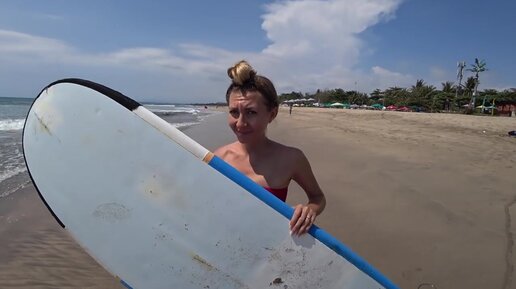 Отдых на Бали - блондинка учится стоят на серфинге, падает сразу, это на видеть!