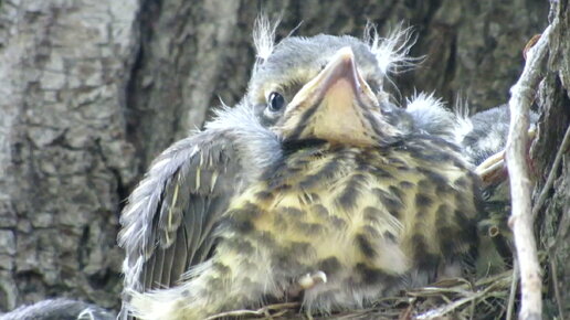 Птенец дрозда-рябинника балдёжно дремлет в гнезде