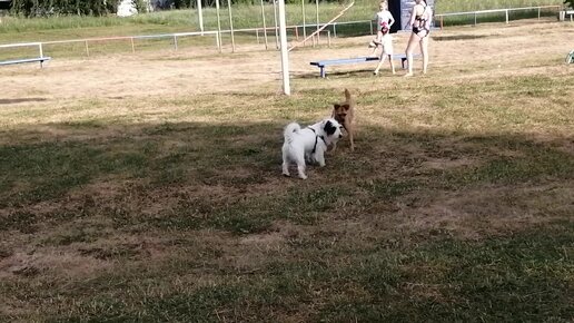 На речке бродячая собака подозвала к себе домашнюю собаку. Показываю