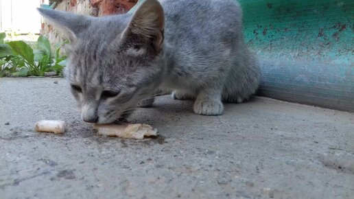 Кормим сельскую кошку. Бараньи рёбрышки... хрустит за милую душу)))