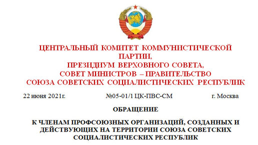ОБРАЩЕНИЕ ЦК КПСС, Президиума Верховного Совета СССР к профсоюзам от 22.06.2021г.