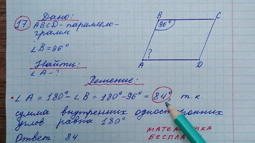 17) Один из углов параллелограмма равен 96°. Найдите меньший угол этого параллелограмма. Ответ дайте в градусах. ОГЭ по математи