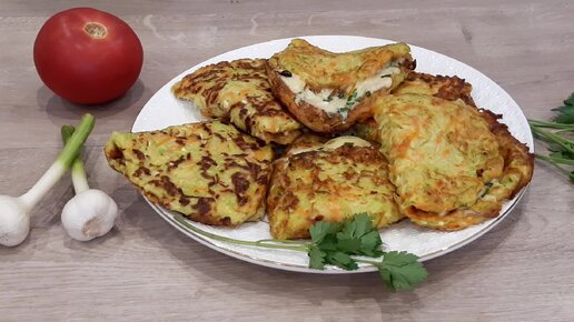 Подруга подсказала рецепт оладьев из кабачка с сырной начинкой.